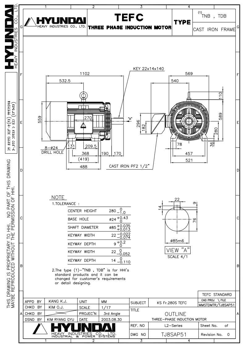 Hyundai Three-phase Induction Motor 120HP 90KW 6P 440V Horizental B3