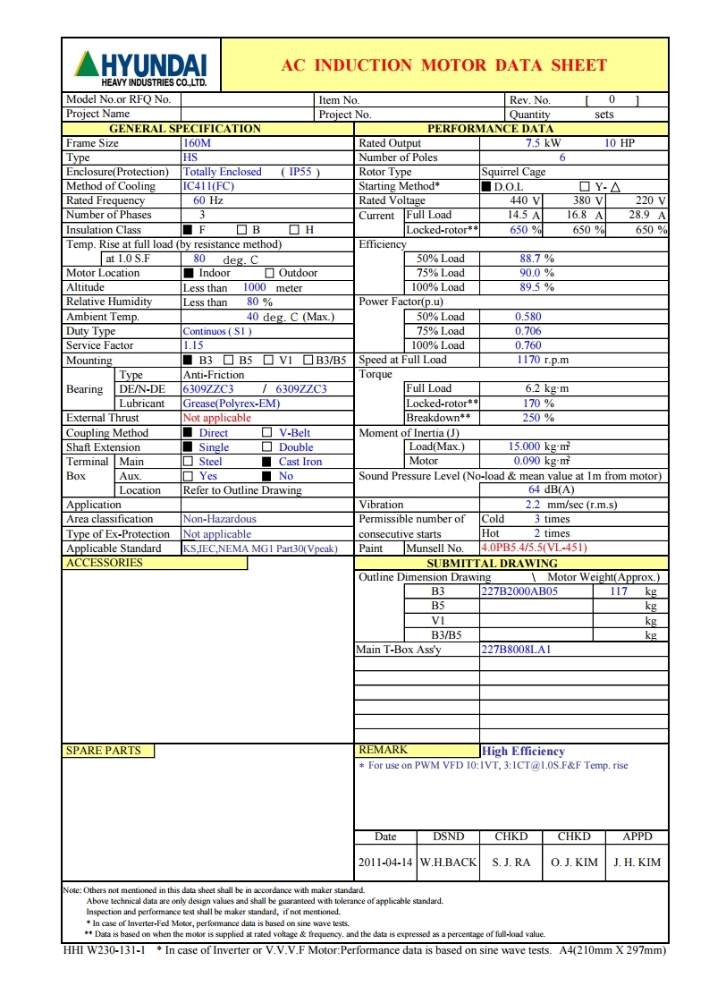 Hyundai Three-phase Induction Motor 10HP 7.5KW 6P 380V Horizental B3