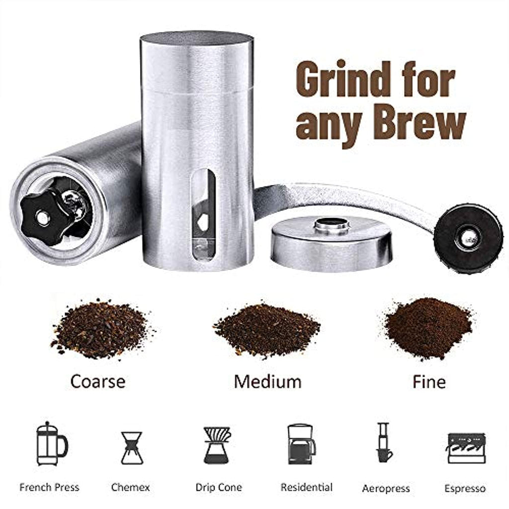 • ☕Built-in adjustable grind selector: Built-in adjustable grind selector, manual coffee grinder can be adjustable to achieve any desired size by simply turning the grind knob. You can Brew for Pour Over, Drip, Chemex, Cold Brew, French Press, Percolator, AeroPress, Turkish, Espresso, Keurig K-Cup, Herb, or Spice grind.